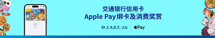 使用 Apple Pay 付款,方便快捷又安全!于推广期内,凭交通银行信用卡成功登记1交通银行信用卡“Apple Pay大激赏”推广计划,把合资格卡信用卡绑定Apple Pay及消费可享高达港币1,220元签账回赠。立即绑卡尽享优惠!