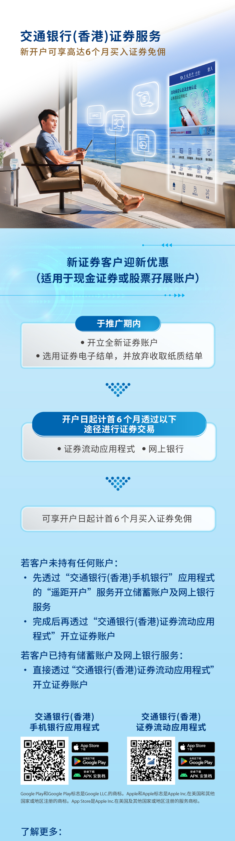 未持有任何存款账户的客户,可透过遥距开户服务申请请按此于本行已持有储蓄账户及网上银行服务,可透过证券流动应用程式申请请按此上述优惠的相关条款及细则,请按此。