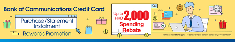 Cardholders who apply for accumulated HKD100,000 Purchase/Statement Instalment with 12 months repayment period with Bank of Communications Credit Card within the promotion period, can enjoy HKD2,000 Spending Rebate!