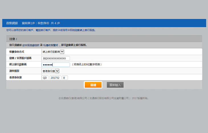於網點領取密碼函的客戶,請選擇以網上銀行啟動碼作為核實身份方式,客戶亦可選擇以提款卡號碼、信用卡號碼*或電話銀行服務作為核實身份方式,再按頁面要求輸入所需資料。