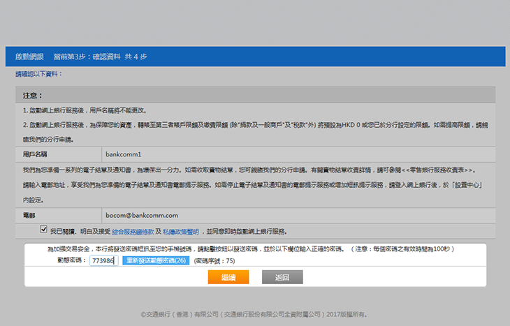 設定您的用戶名稱、登入密碼及電郵地址(如適用),然後請點撃「綜合服務總條款」及「私隱政策聲明」以閱讀有關網上銀行服務的條款及細則。剔選有關方格確認,再按「繼續」往下一頁。