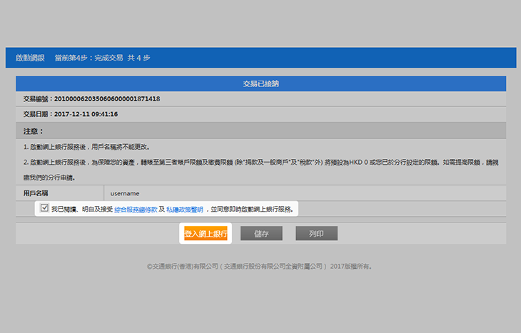 您已經完成登記程序,可即時按「登入網上銀行」享用服務。