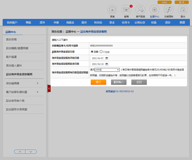 您可為所選擇的提款卡或信用卡設定每日最高提款限額、服務開始日及結束日,然後按「提交」。