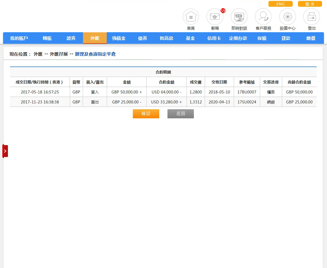 請檢查交易資料, 如正確請按「確認」,如欲取消交易,請按「返回」。