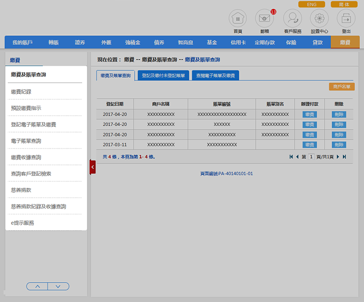 | • | 查詢客戶登記檢索 - 查詢客戶已提交的賬單登記資訊。 |