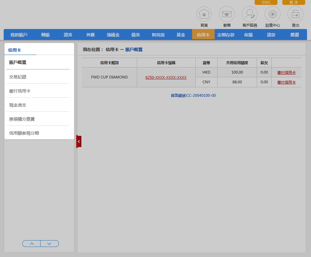 - 顯示信用卡的信用額、最低付款額、總結欠、截數日、到期繳付日、當期月結單結欠、積分結餘和積分到期日等資料;