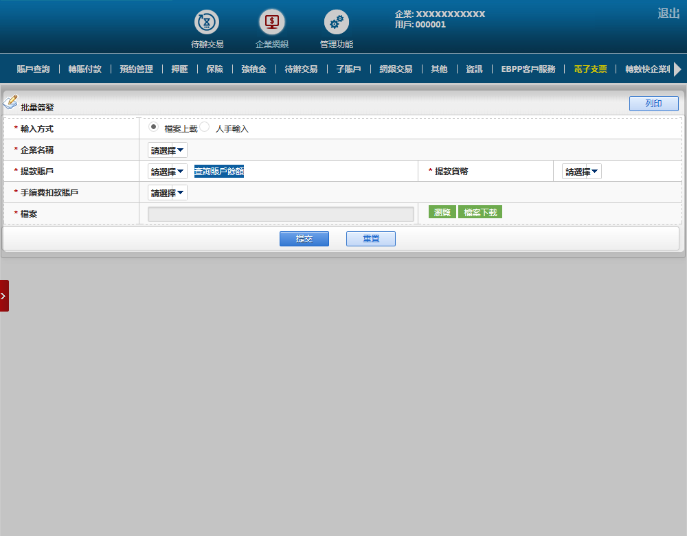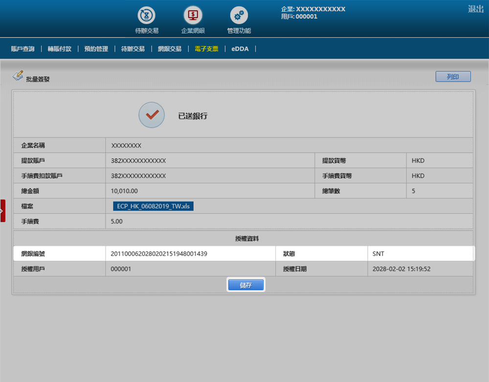 交易完成後,頁面將顯示已送銀行成功及網銀編號。您可點擊「檔案」以下載「上傳檔案」,或按「儲存」有關頁面以作紀錄。