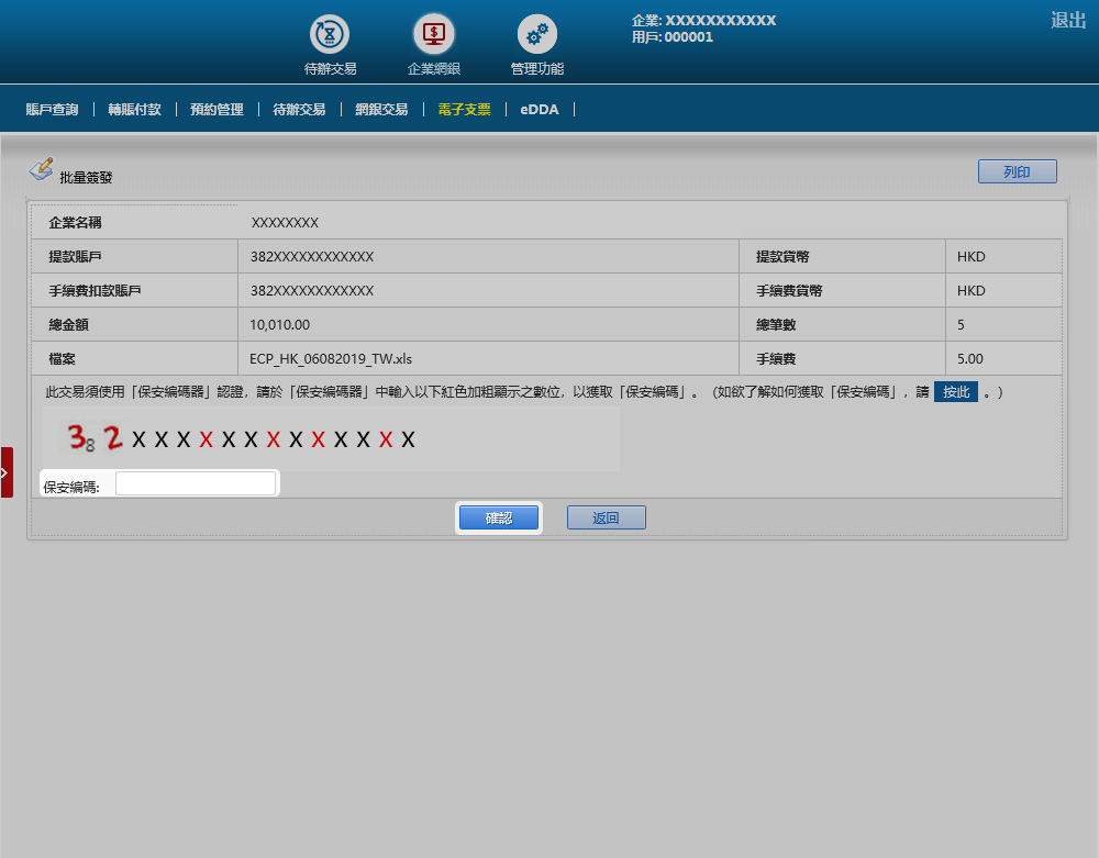 核對已輸入的交易資料正確或更改有關資料後,請使用保安編碼器進行認證,再按「確認」繼續。