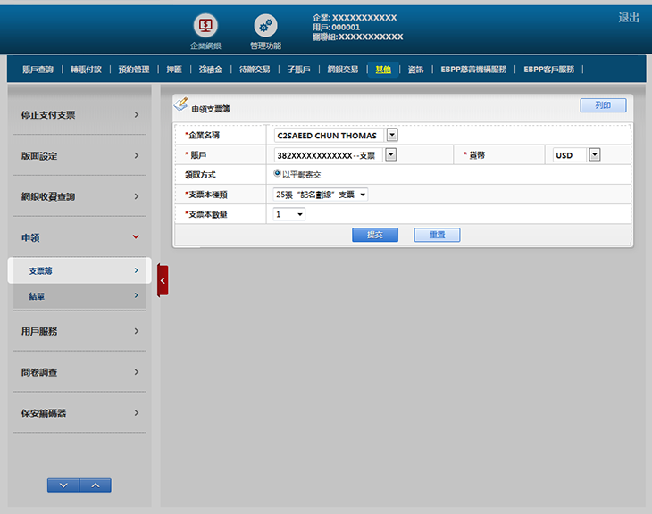 於「其他」選擇「申請」中的「支票簿」,然後於右方位置選擇所需資料,再按「提交」。