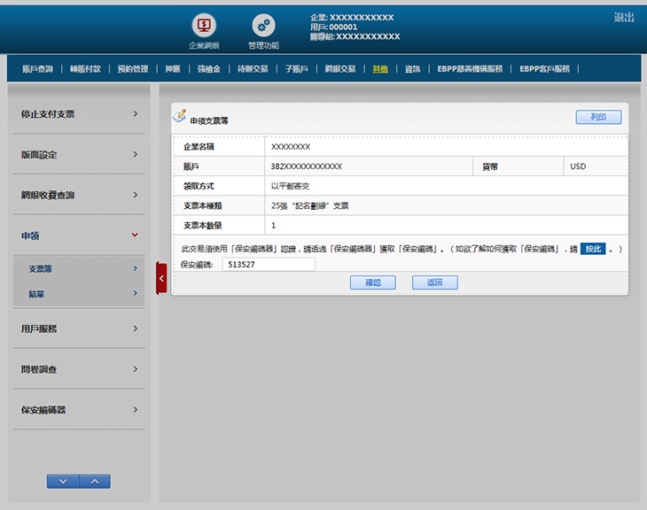 核對已輸入的資料正確或更改有關資料,然後請使用保安編碼器進行認證,再按「確認」繼續。