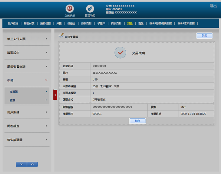 交易完成後,頁面將顯示交易成功及網銀編號。您可按「儲存」或「列印」有關頁面以作記錄。