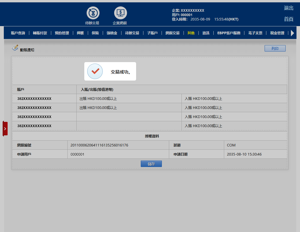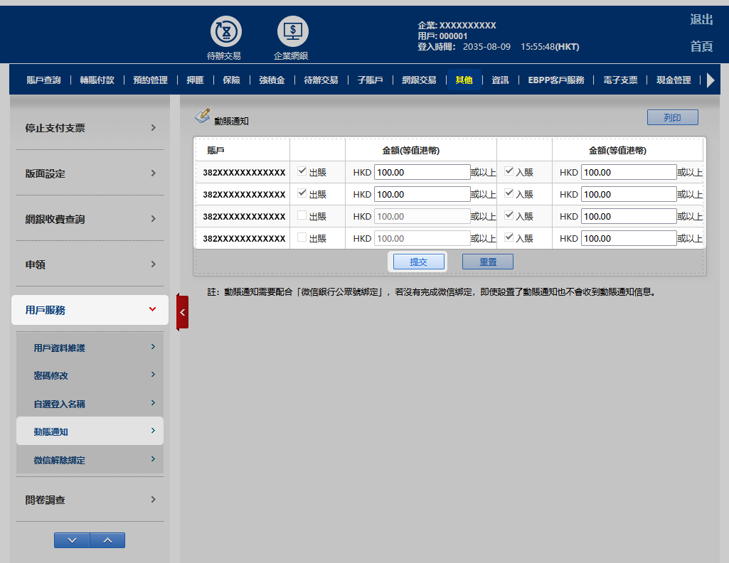 於「其他」選擇「用戶服務 」,再按「動賬通知」功能設置已掛於企業網上銀行之賬戶,可自行剔選欲收到動賬通知的賬戶及設定發動動賬通知的交易金額(等值港幣)。