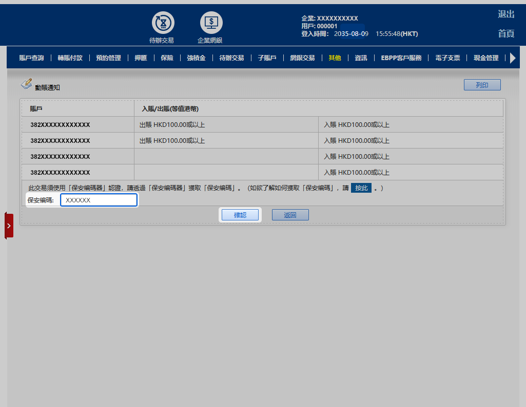 於「動賬通知」功能設置出賬及入賬的提示後,輸入保安編碼,然後按「提交」。