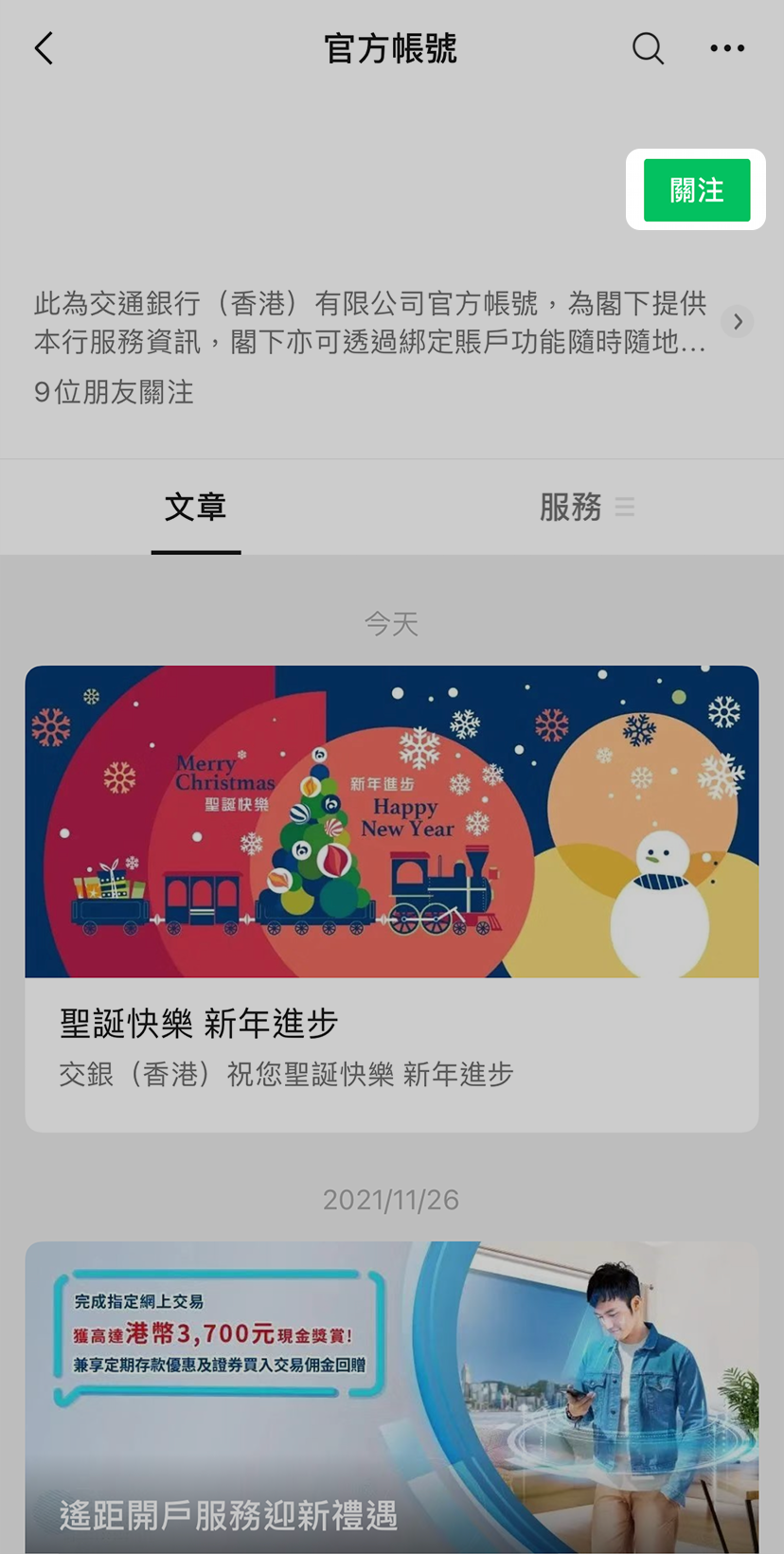 進入「交銀香港」微信官方帳號後按「關注」官方帳號。