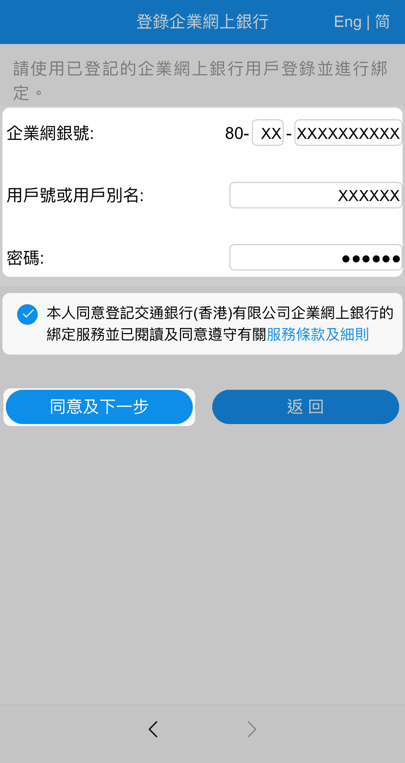 輸入企業客戶於本行登記之企業網上銀行資料,包括企業網銀號、用戶號/用戶別名及密碼並閱讀及同意有關服務之條款及細則,然後按「同意及下一步」。