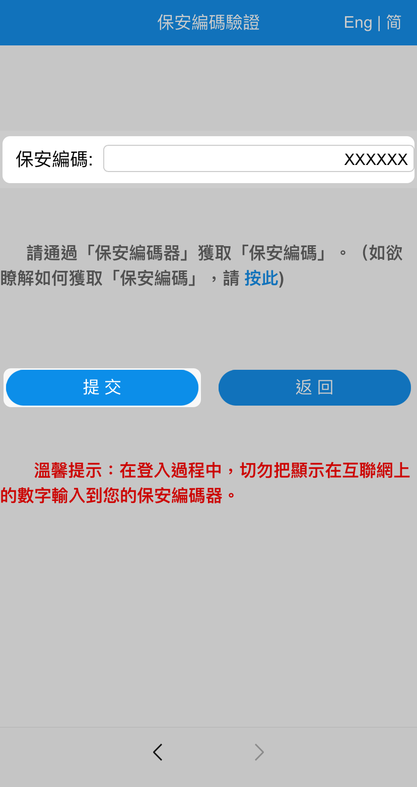 正確輸入企業網上銀行資料後,再輸入保安編碼,然後按「提交」。