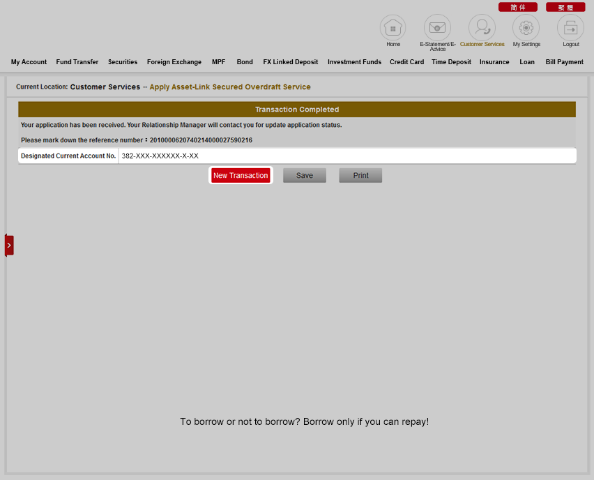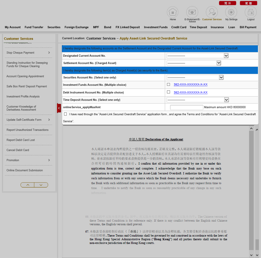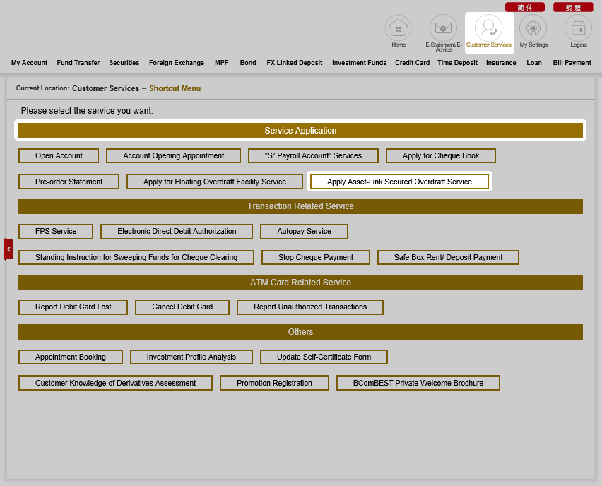 Press the "Customer Services" icon on the top right side of the page, a short cut menu will be displayed on the screen. Please select "Apply Asset-Link Secured Overdraft Service" in the "Service Application" section.