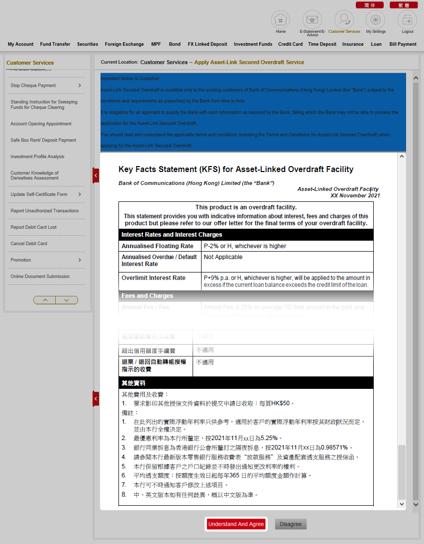 The Key Facts Statement (KFS) for Asset-Linked Overdraft Facility will be displayed. After reviewing the document, if agree, please select "Understand And Agree". Should you select "Disagree", the screen will return back to the Bank’s first page.
