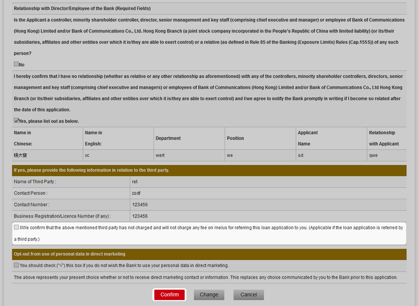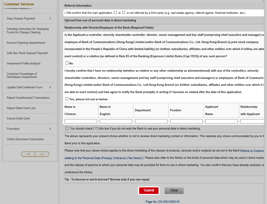 At the lower part of the same page, please confirm: (1) the loan application is/is not referred by a third party;and (2) the relationship with director/employee of the Bank , and select "Submit". If you do not wish the Bank to use your personal data in direct marketing, you can select the declaration box in the page.