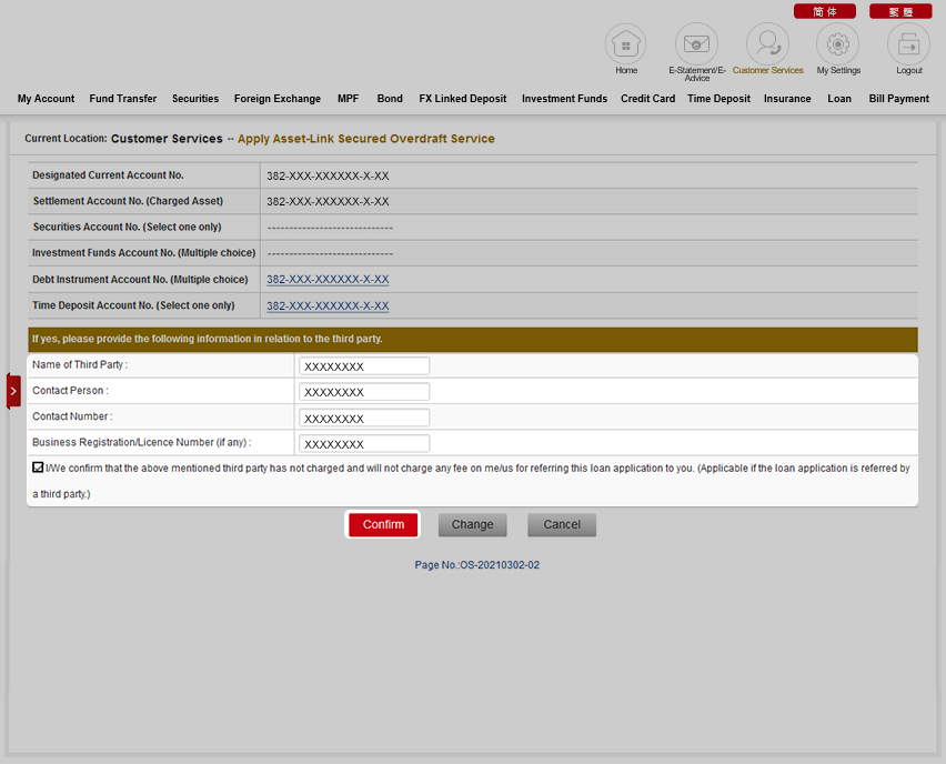 Customers can select "Change" if they wish to amend the inputted information; or select "Confirm" if the inputted information is correct.