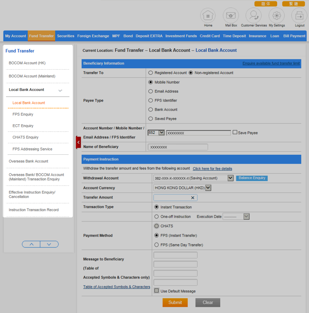 | • | Local Bank Account - 1. Transfer funds to both pre-registered and unregistered accounts of other local banks by CHATS, money transferred by CHATS would be transferred to the recipient account(s) within the same day; 2. Transfer funds to both pre-registered and unregistered accounts of other local banks by FPS (Instant Transfer), money transferred by FPS would be transferred to the recipient account(s) immediately |