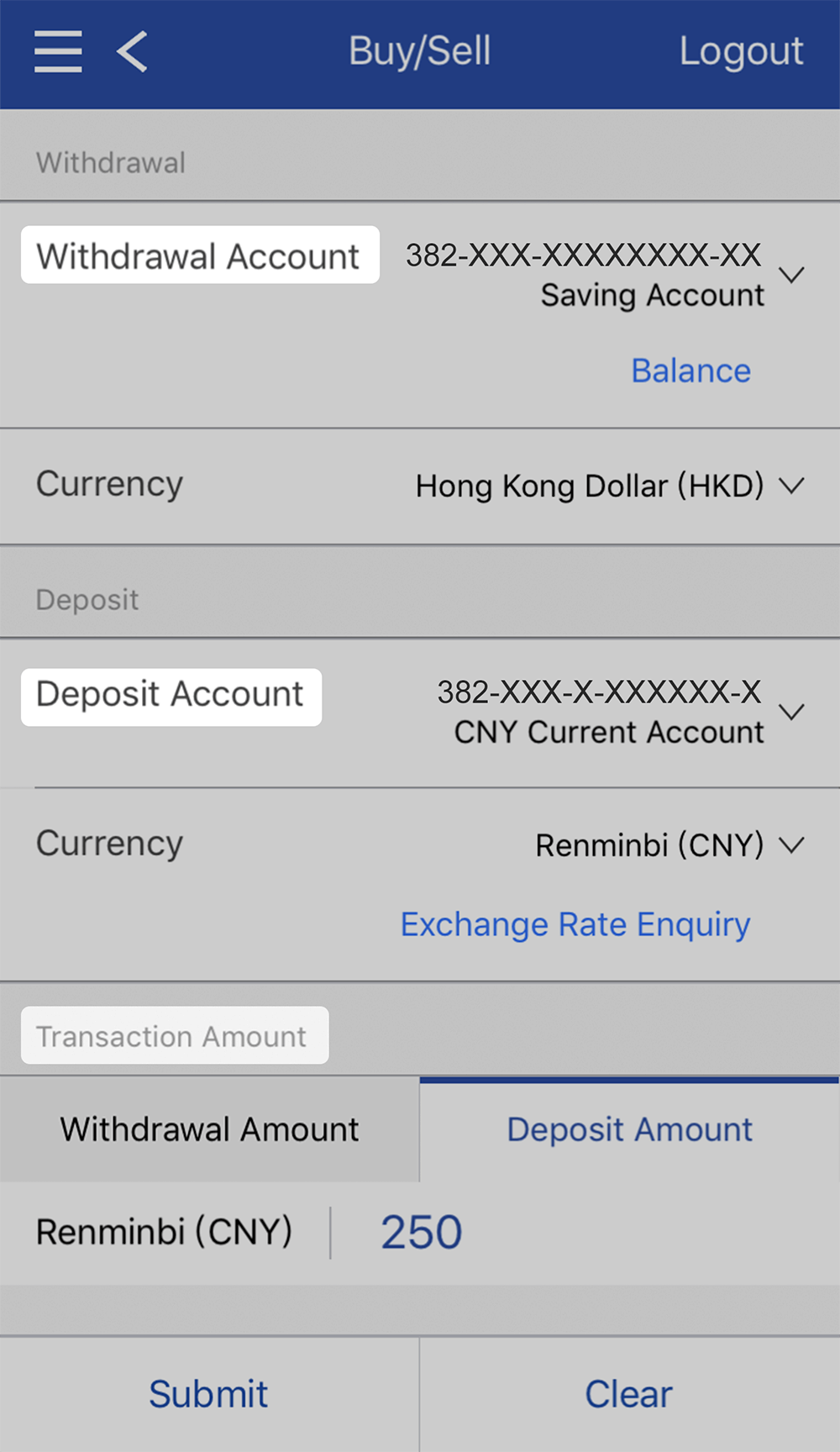 Select the Withdrawal/Deposit Amount and Currency from withdrawal account and deposit account