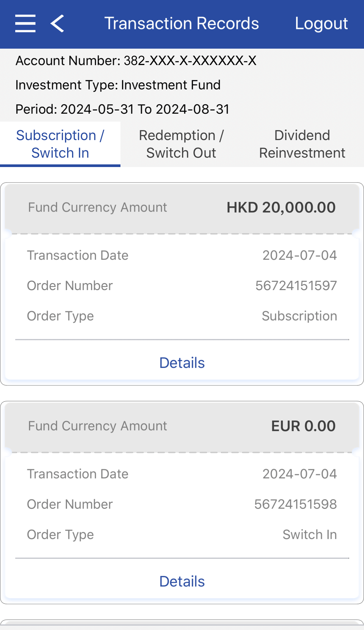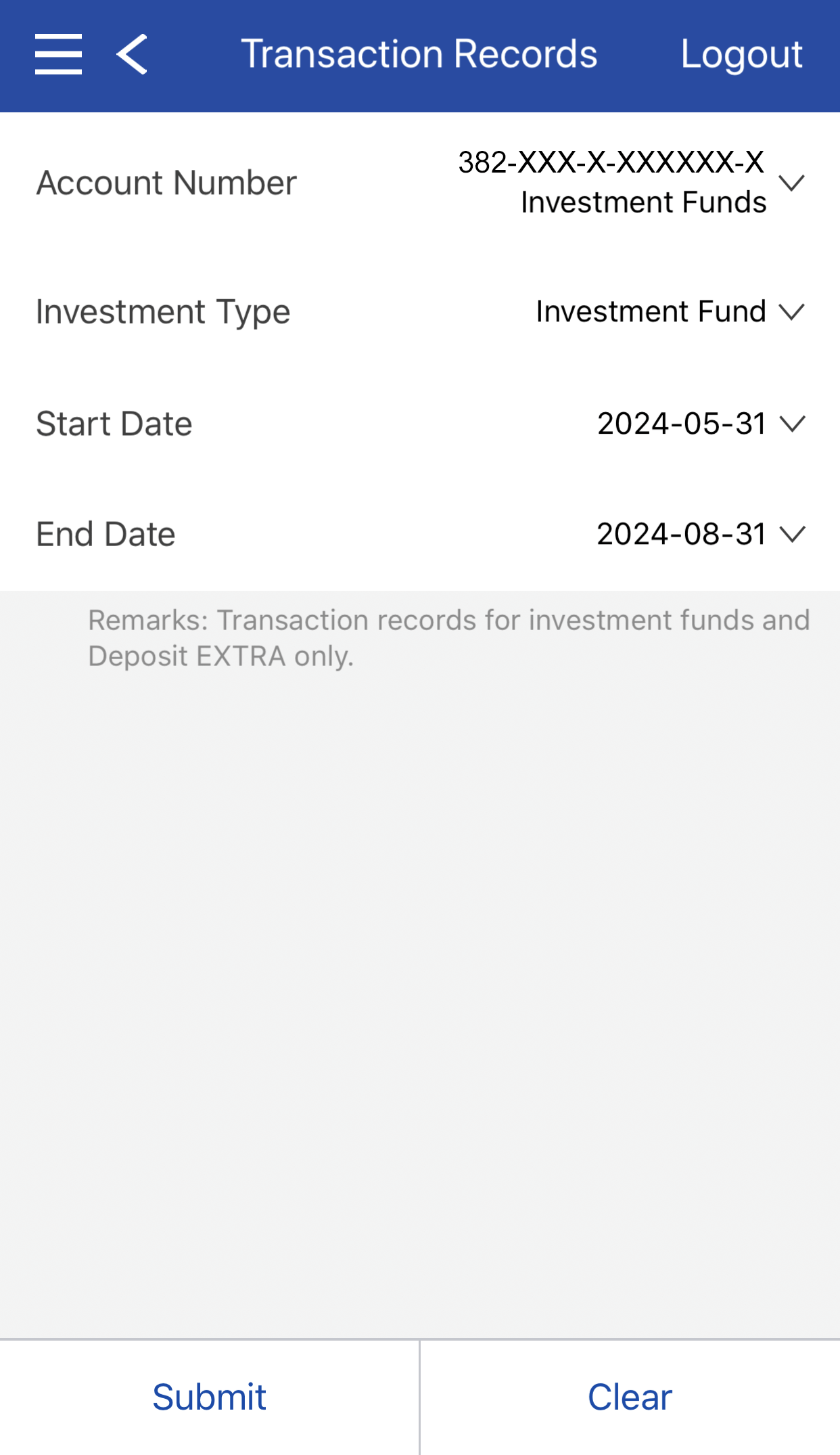 Select Investment Account from the account drop down menu, and enquire transaction records in the past 3 years.