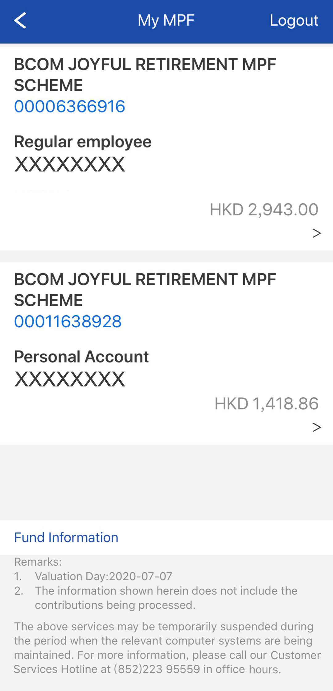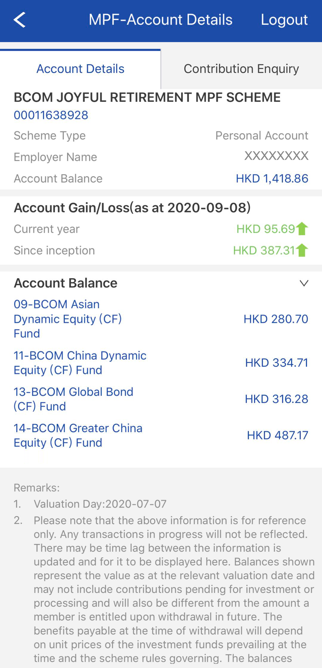 Click specific MPF plan, customer can view the account details of that plan.