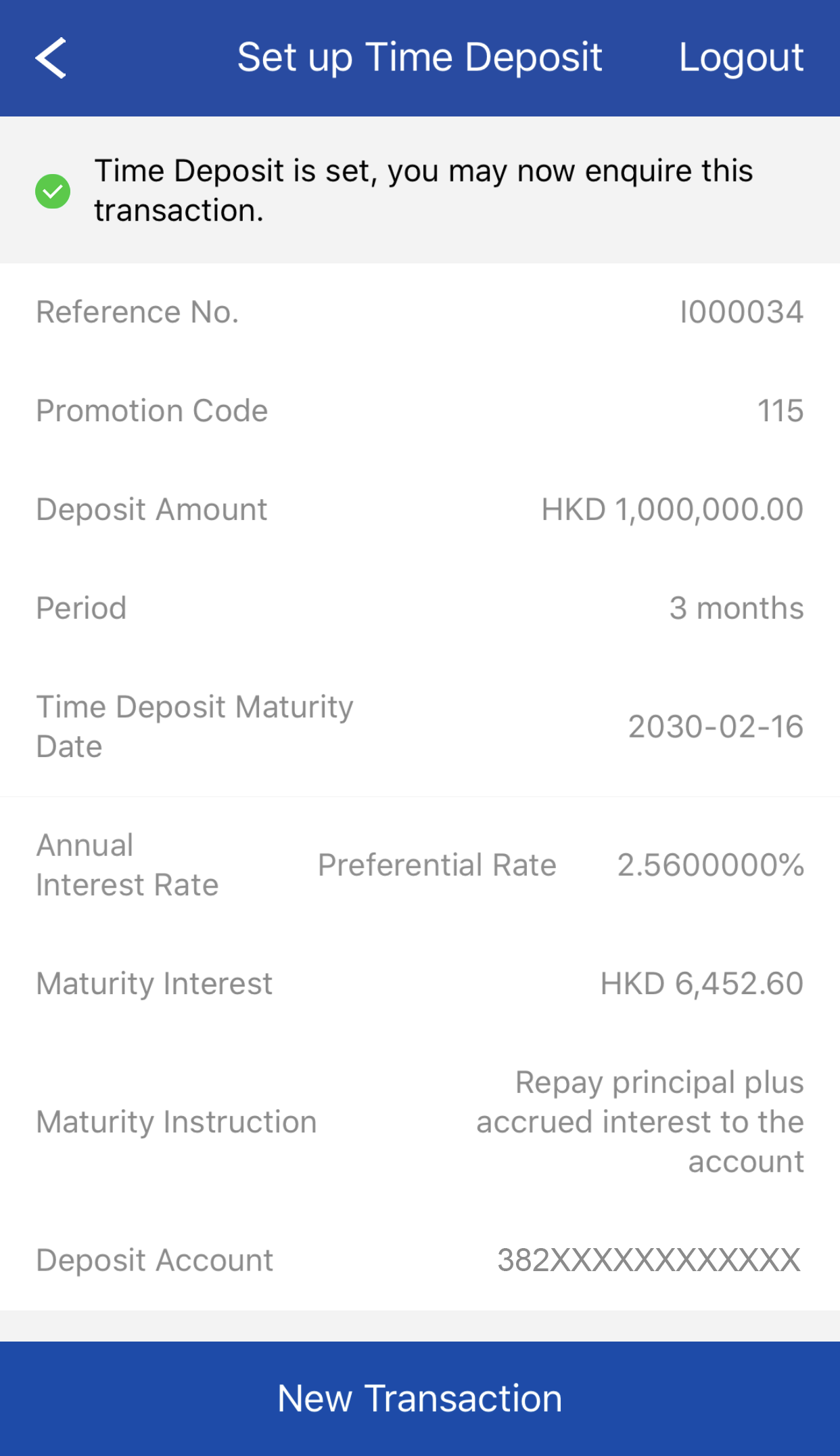 Deposit no. will be displayed after transaction completed. You can also view time deposit details at My Time Deposit function.