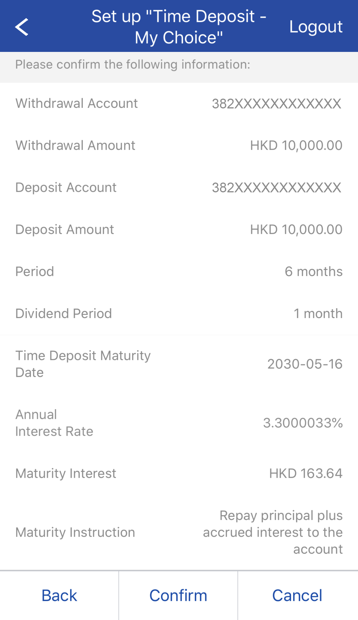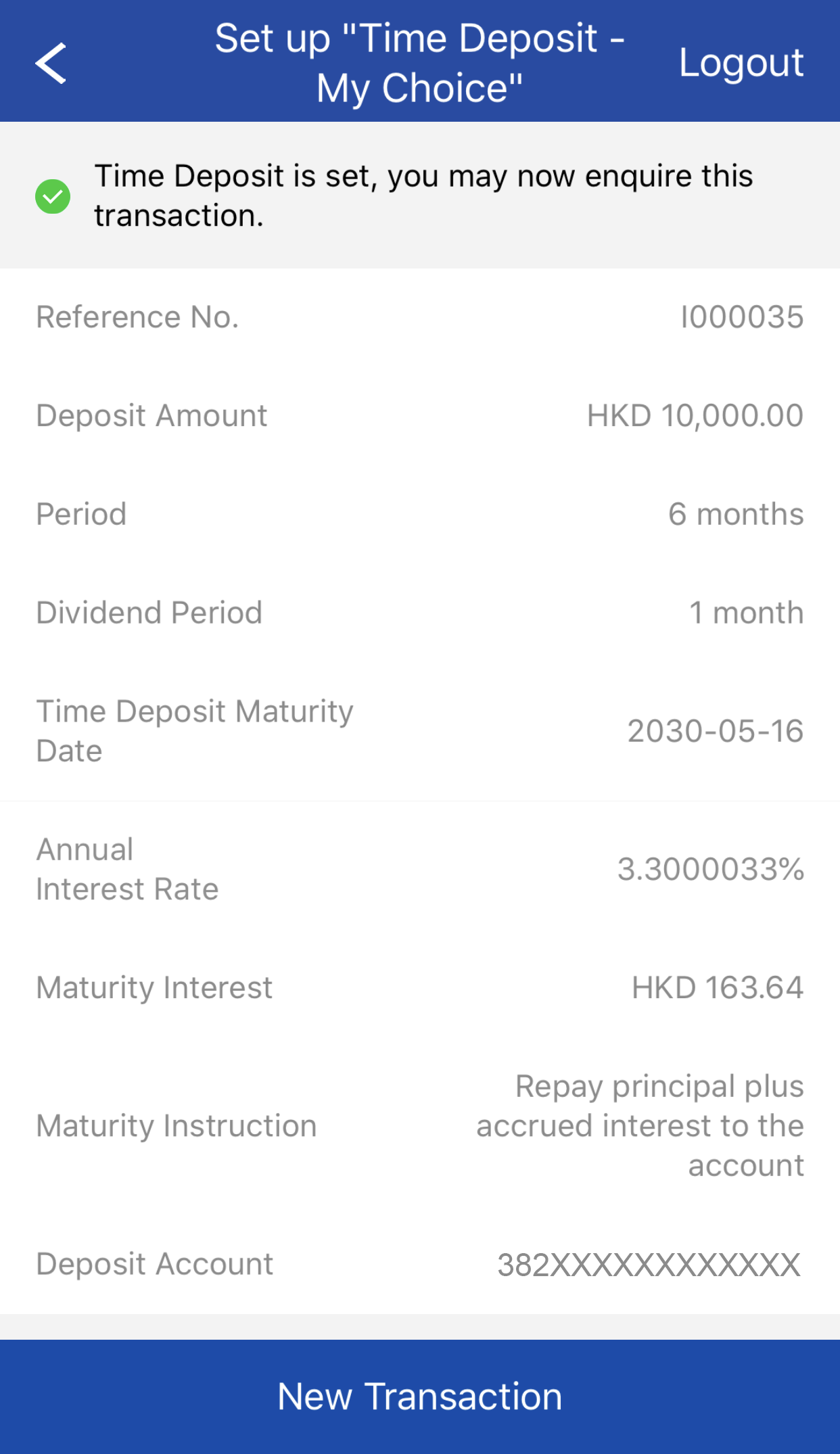 Deposit no. will be displayed after transaction completed. You can also view time deposit details at My Time Deposit function.