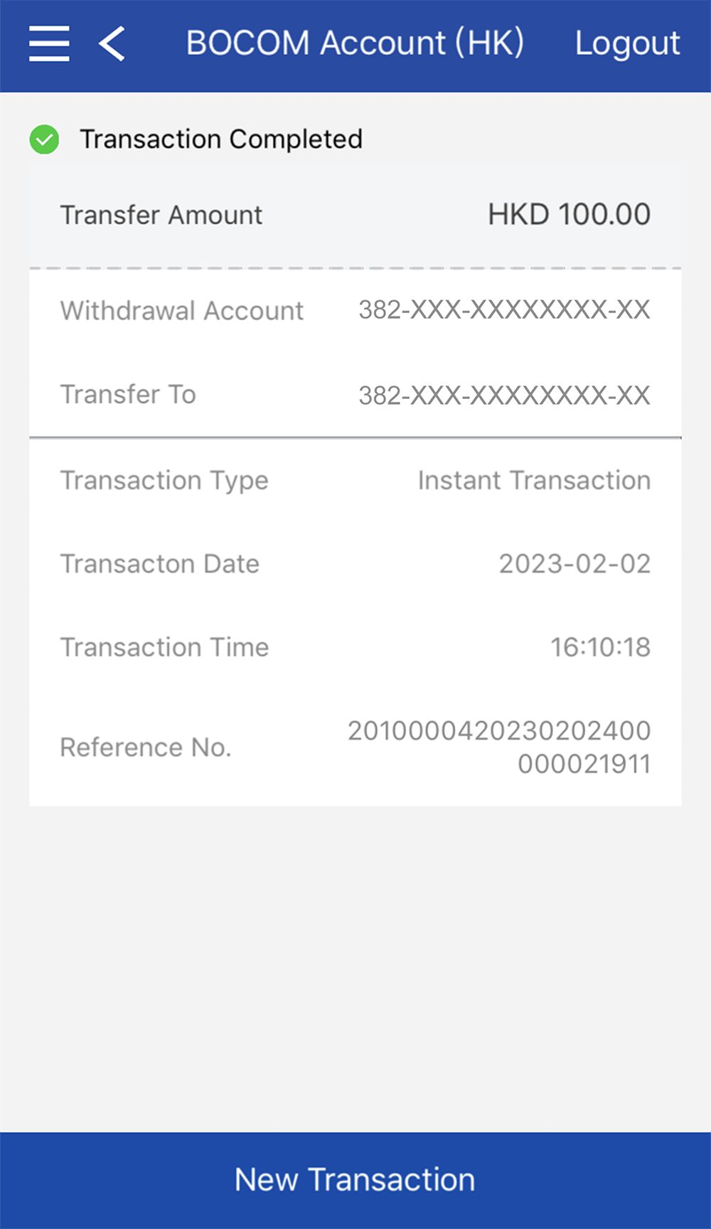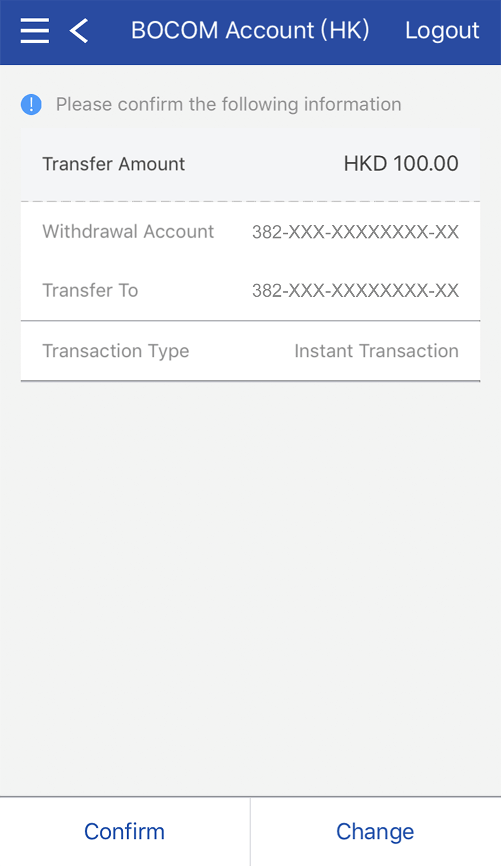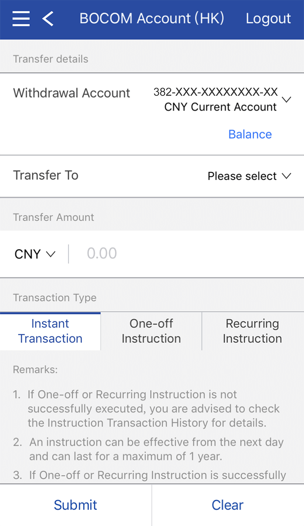 Select BOCOM Account (HK) and enter all necessary information , then press Submit