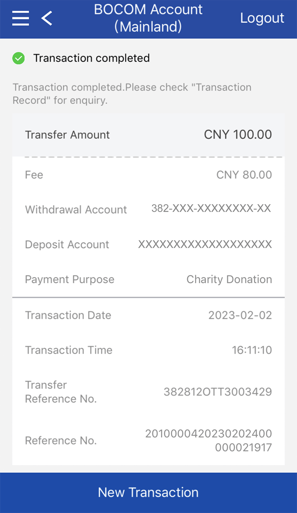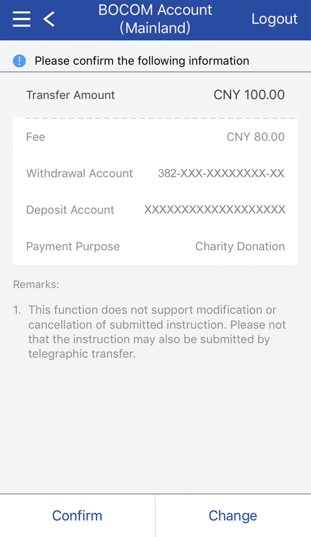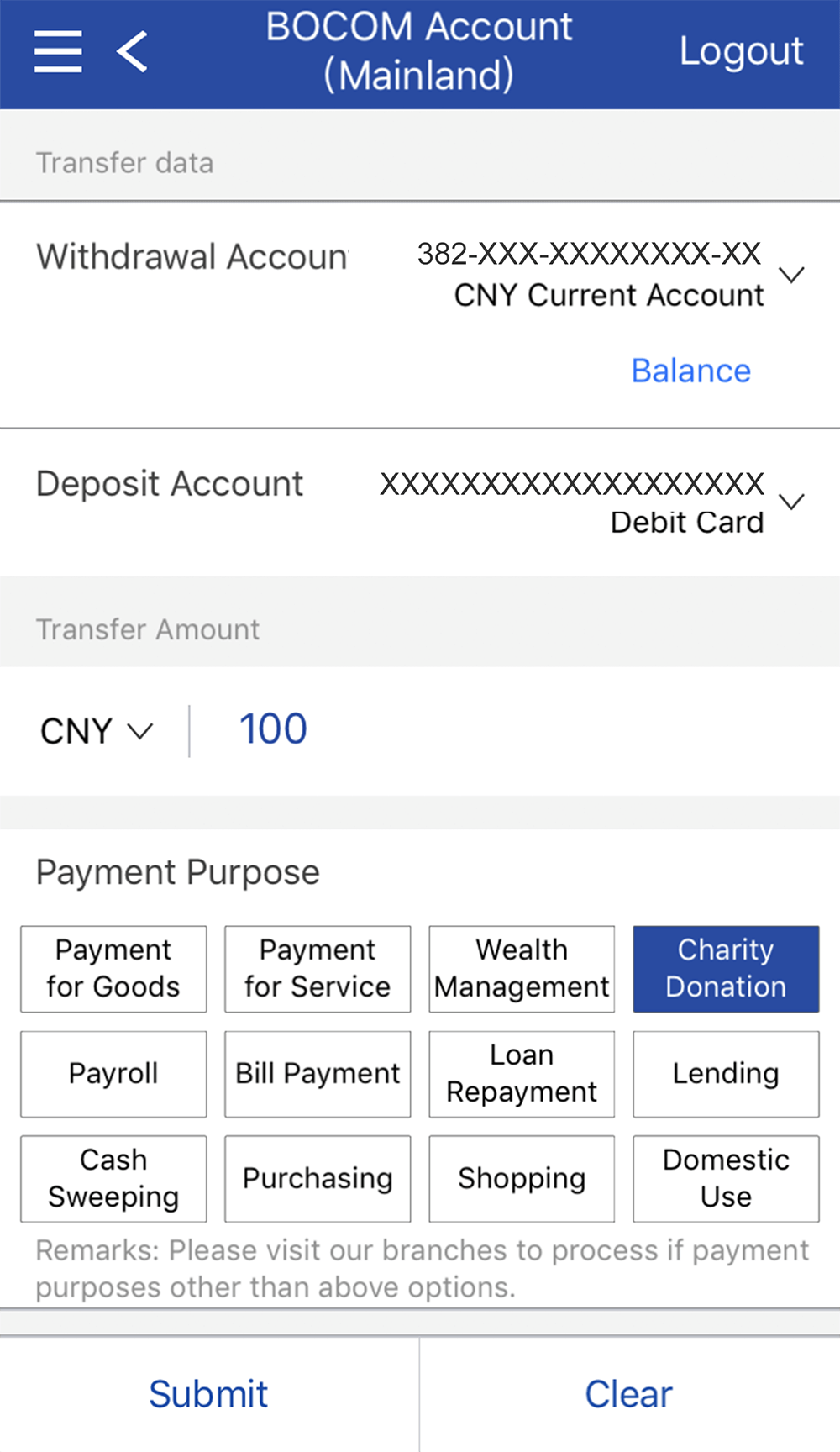 * BOCOM Account (Mainland) must enter Payment Purpose