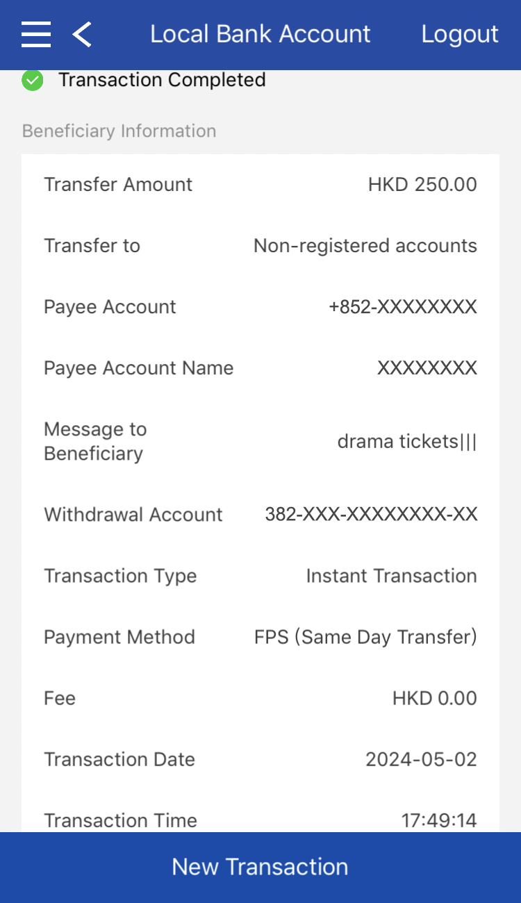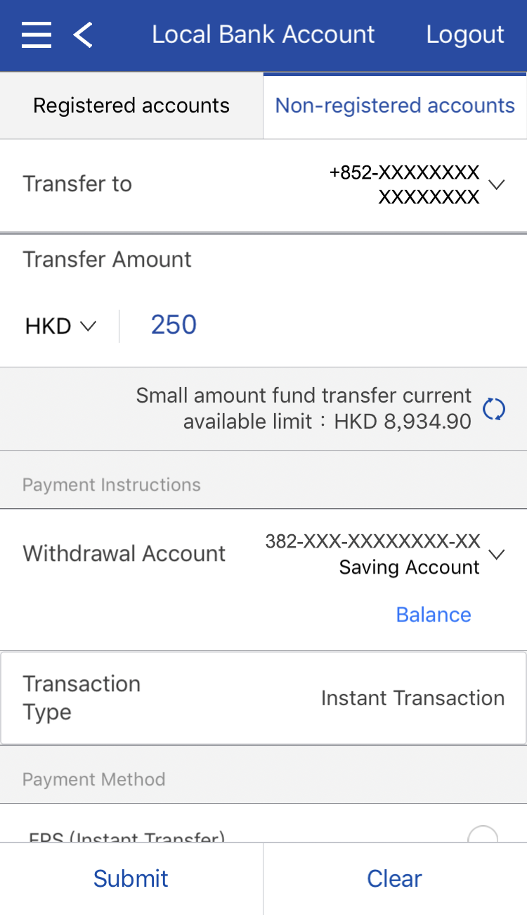You may choose to transfer with mobile phone number, email, FPS ID, bank account number, or saved payee information.