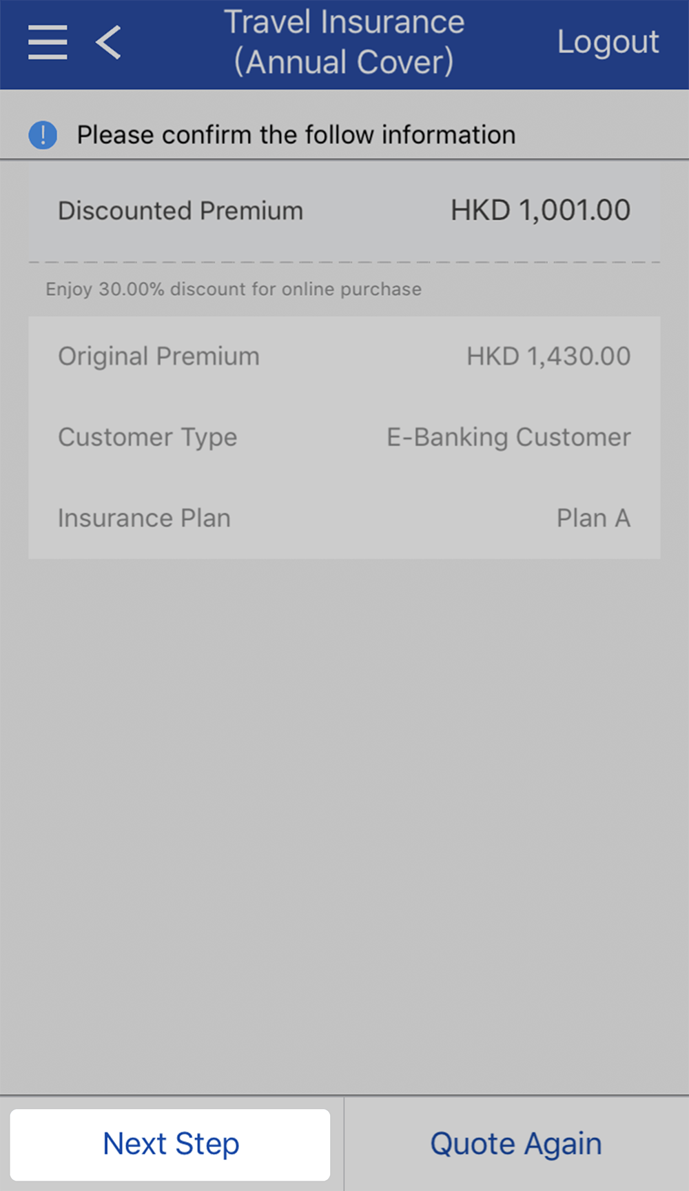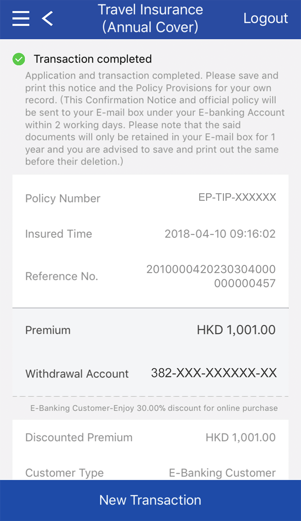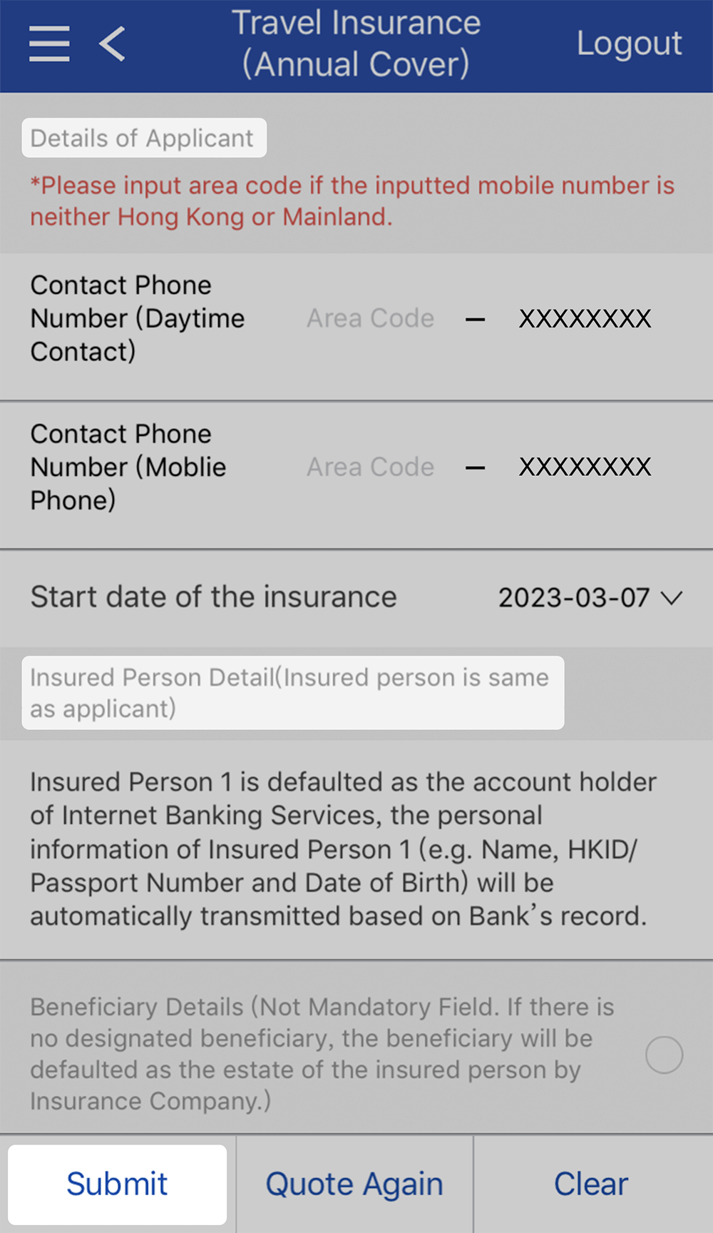 Select the withdrawal account and fill in details of the applicant and insured person, then press Submit upon agree on the declaration.