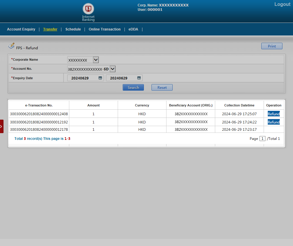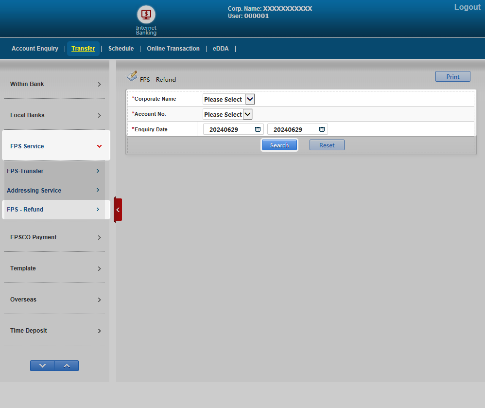 Under Transfer function, FPS Service section, click FPS-Refund on the left menu. Select your searching criteria and click Search to continue.