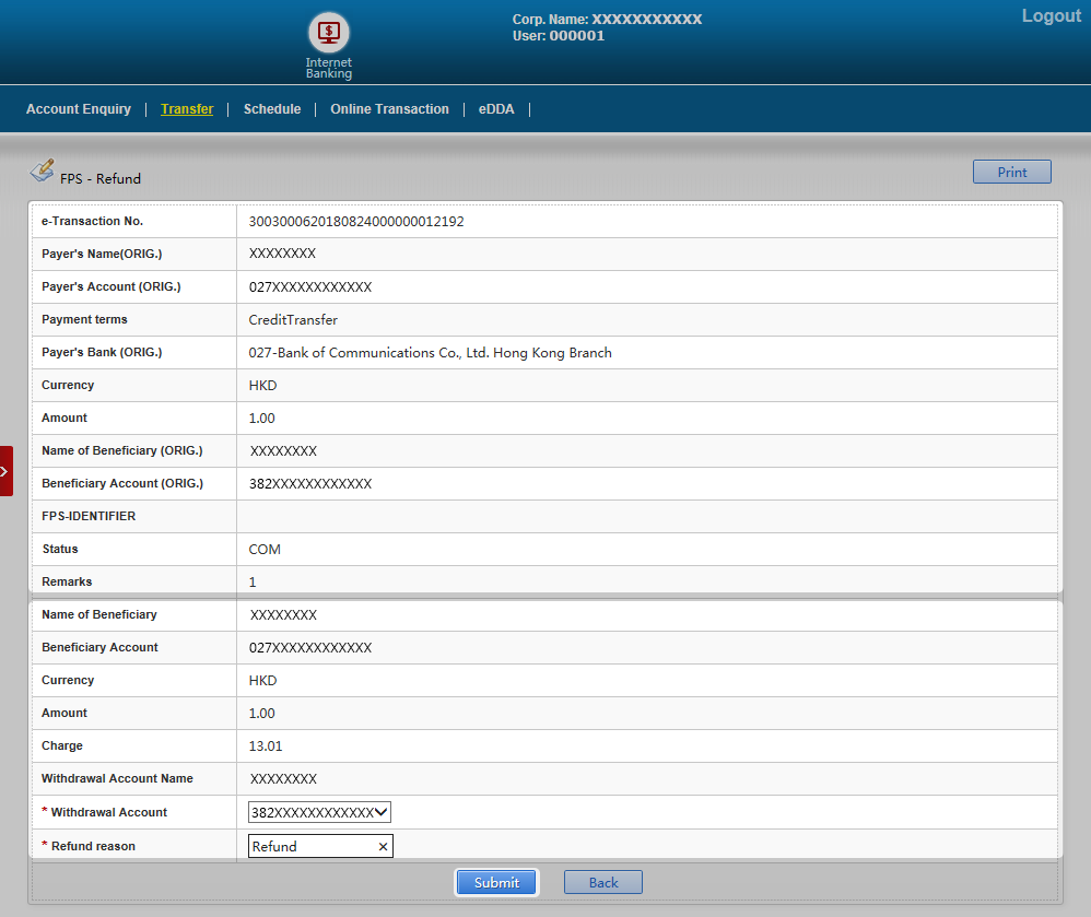 The details of the payment will be shown. Select a withdrawal account and input Refund reason, then click Submit to proceed.
