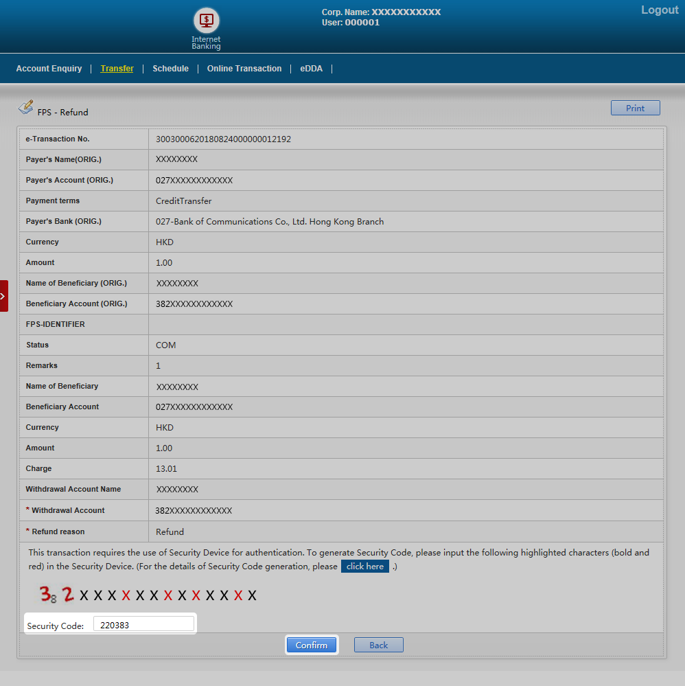 Review the transaction details. Then, input the Security Code for for authentication and click Confirm to submit the instruction.