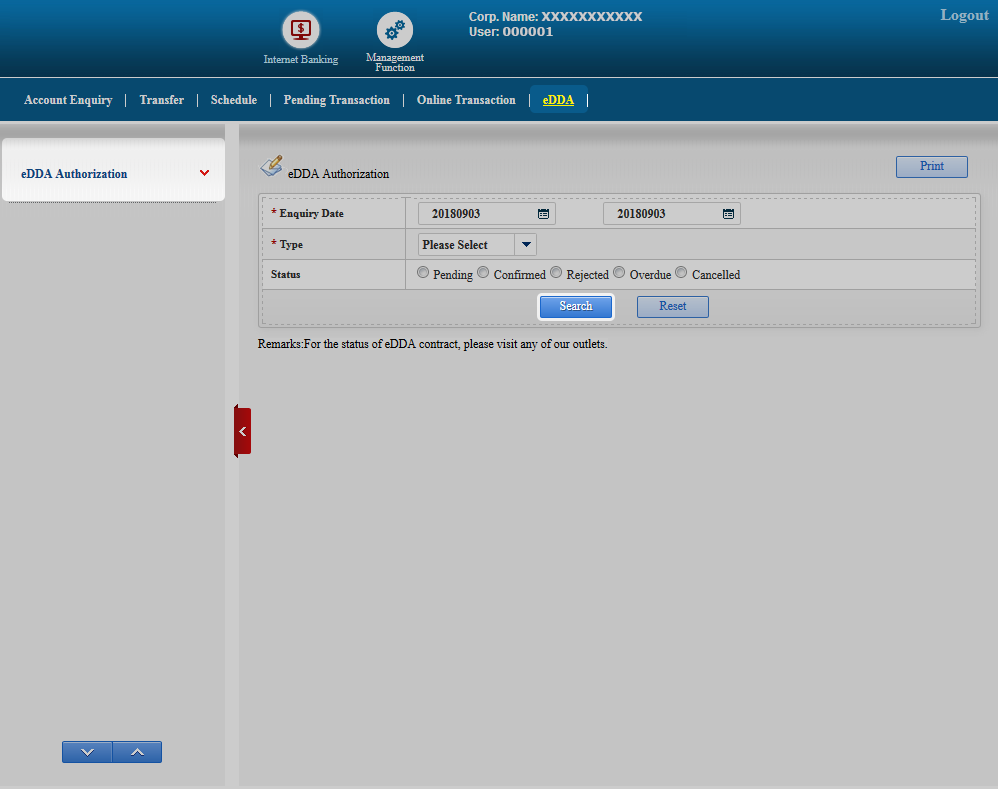 Under eDDA function, click eDDA authorization on the left menu. Select your searching criteria and click Search to continue.