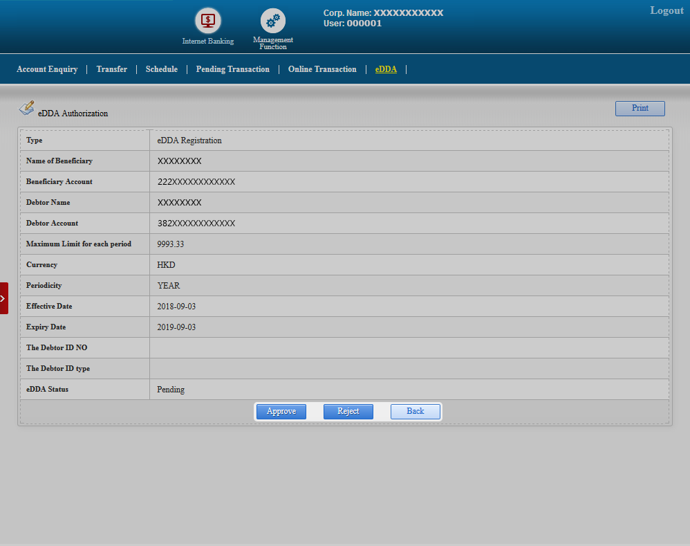 The details of the eDDA instruction will be shown. You can Approve or Reject the instruction when the eDDA status is Pending.