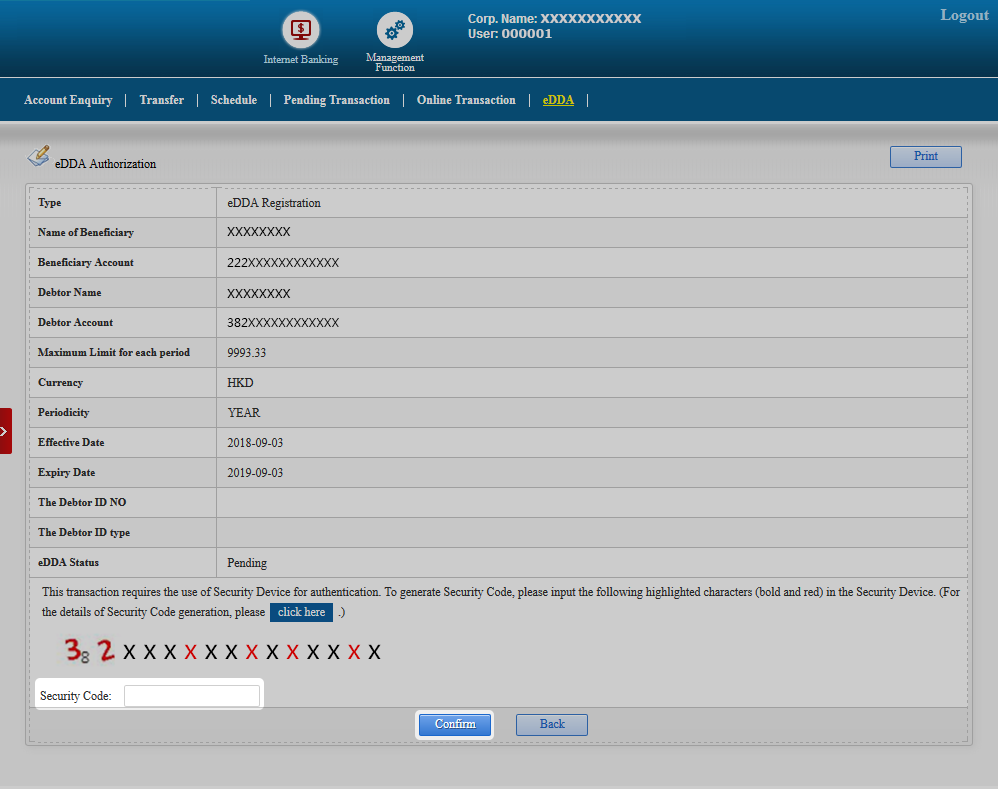 Review the eDDA instruction details. Then, input the Security Code for authentication and click Confirm to submit the instruction.