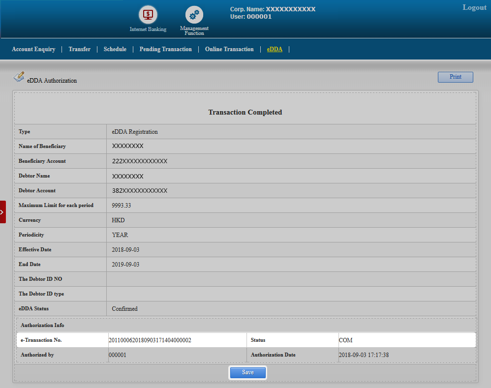 The e-transaction No. and Status will be shown on the page. If you want to save a soft copy of the page, click Save.