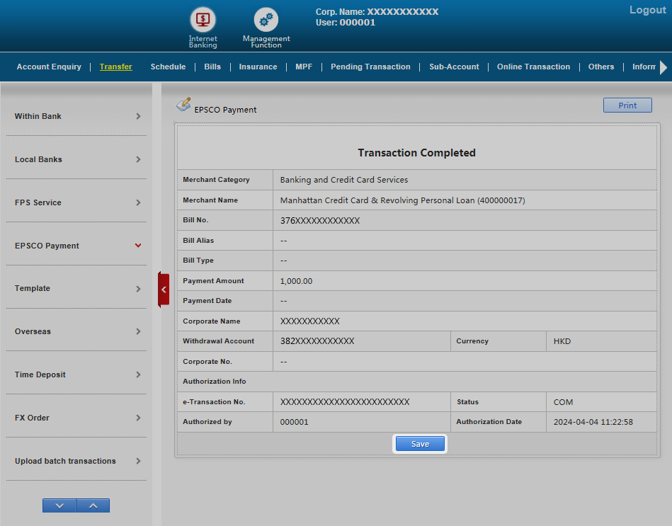 The Window will show the Transaction completed and the e-Transaction No. Pleaase press Save for keeping record.
