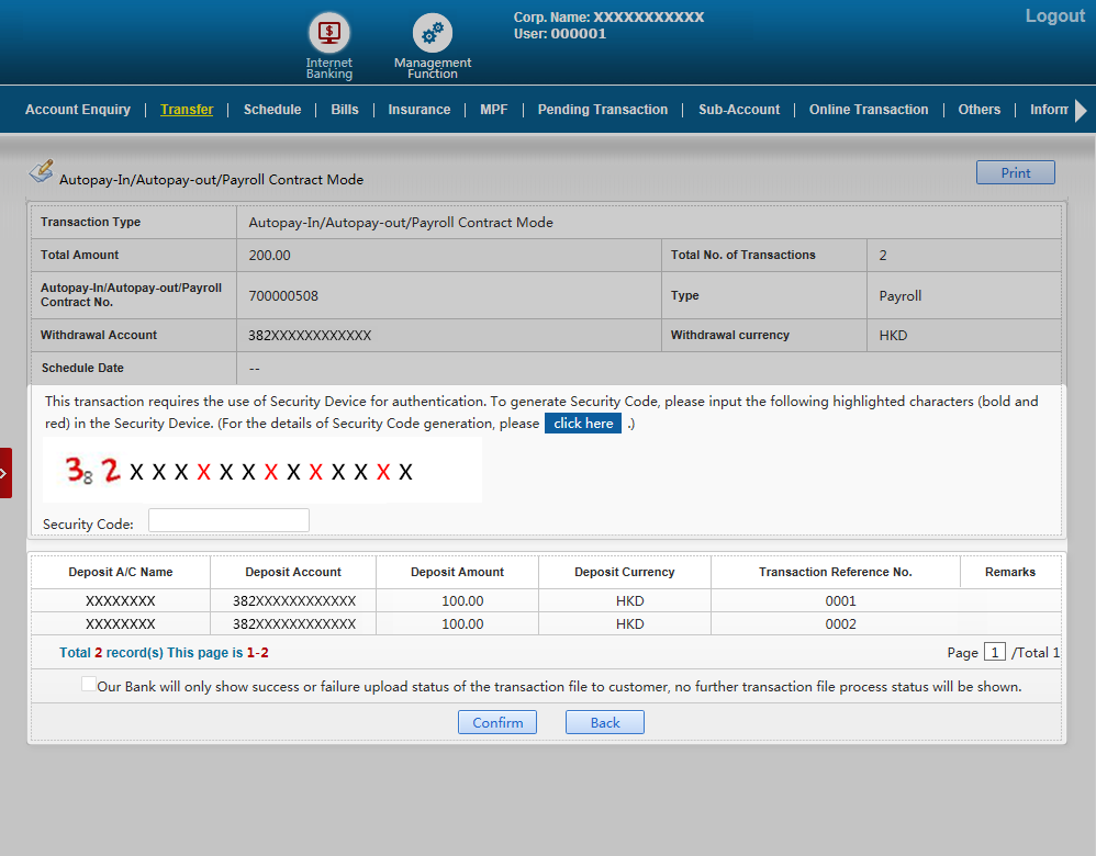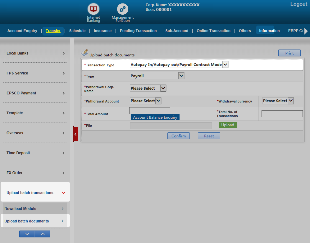 Please select Upload batch transactions under Transfer, and then select Upload batch documents. Please select Transaction Type - Payroll/Autopay-In/AutoPay-Out Contract Mode and upload the relevant document after input all information required. Then, please press Confirm.