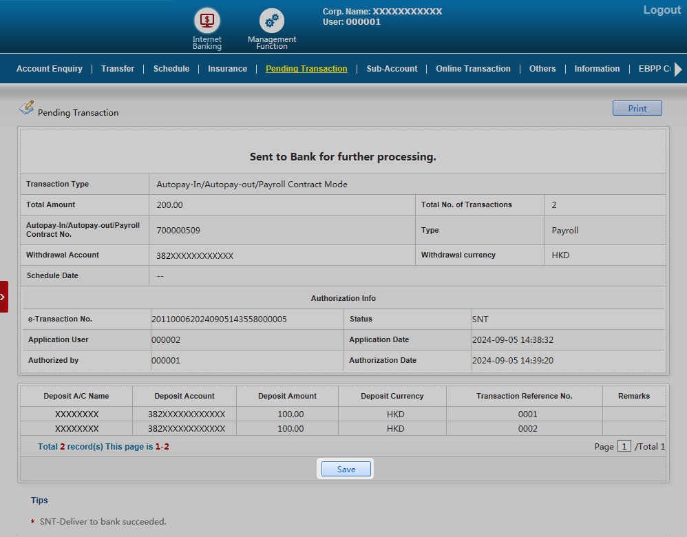 The window display the Transcation "Sent to Bank for further processing" and e-Transaction No. if Transaction completed. Please select Save for keeping Record.
