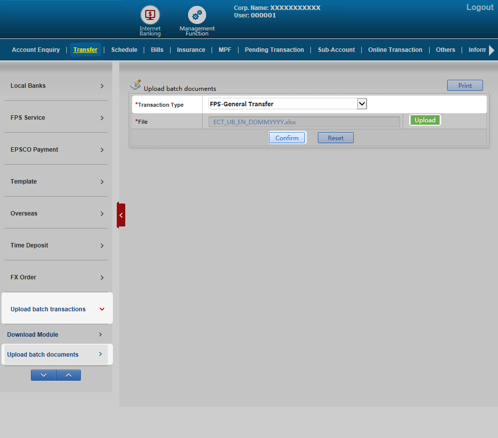 For Transactions Type, please select FPS-General Transfer and click Upload to upload the completed document.