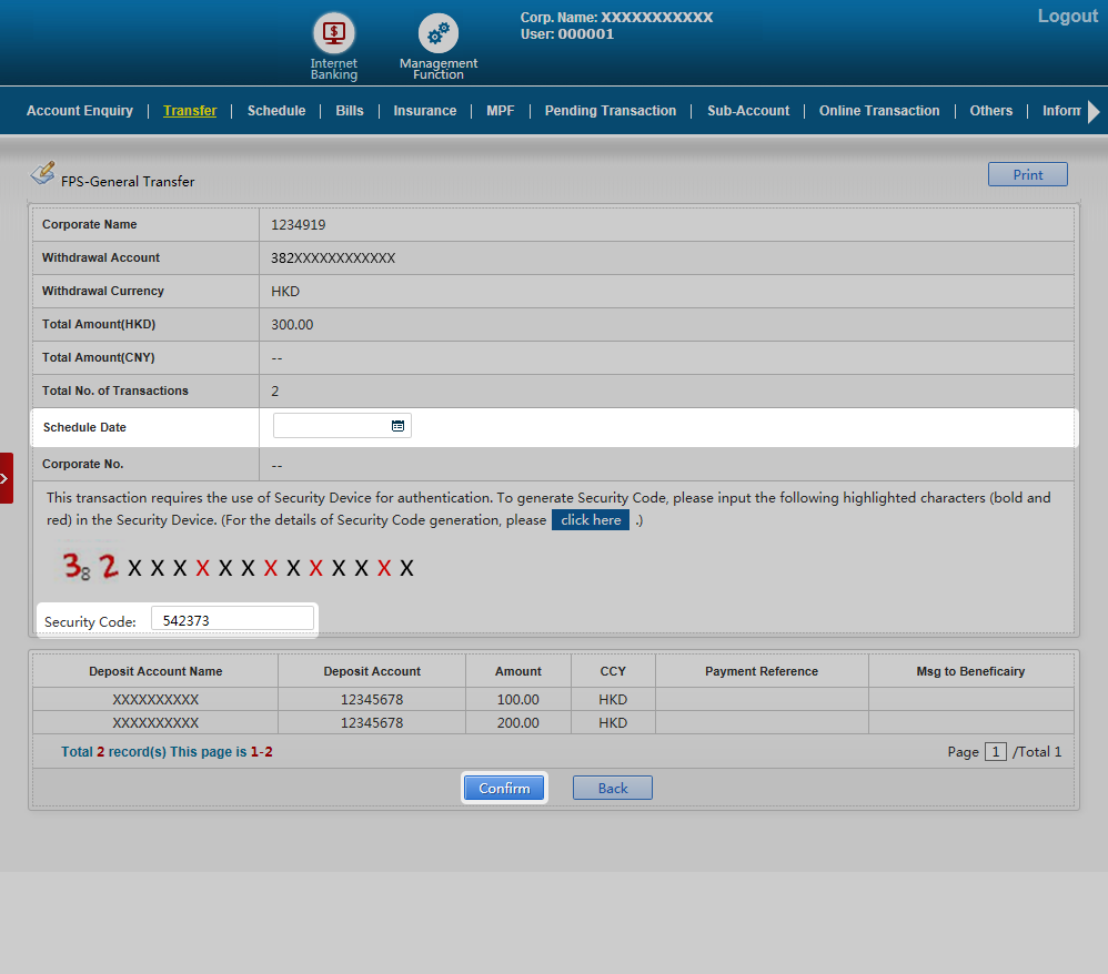 Review the transactions details, then input the Security Code and click Confirm to submit the instruction.