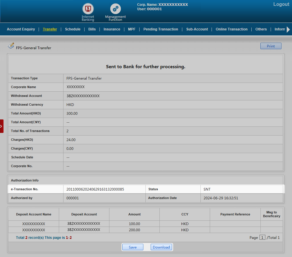 The e-transaction No. and Status will be shown on the page. If you want to save a soft copy of the page or download the transaction document, click Save or Download respectively.