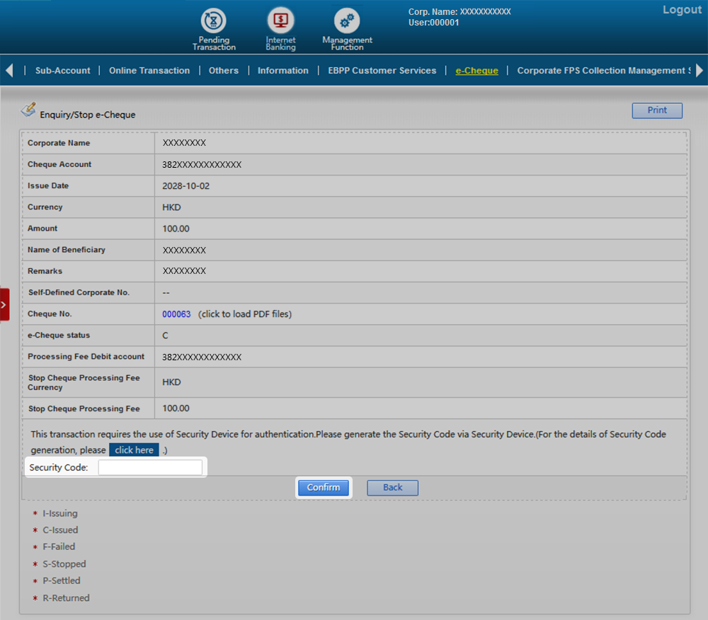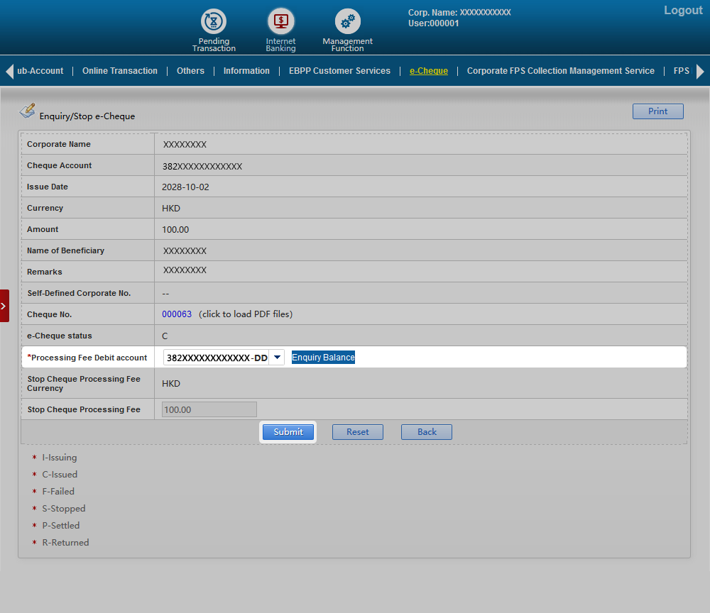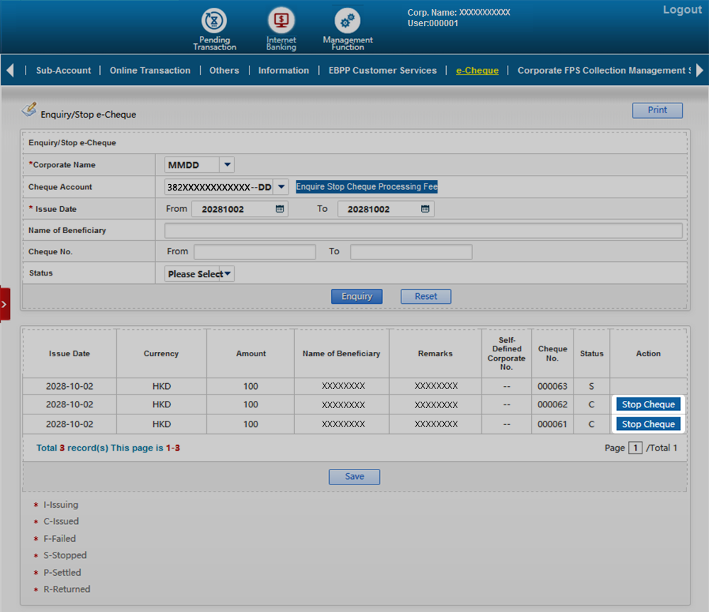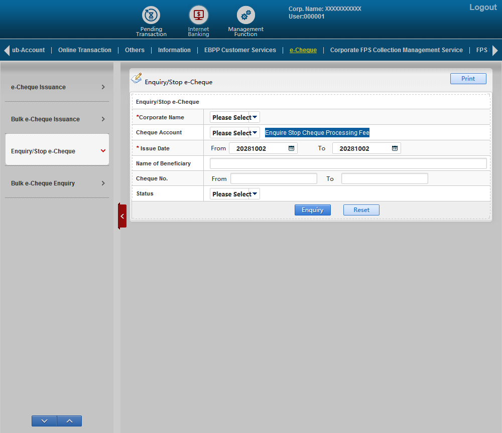 Please click Enquiry/Stop e-Cheque under e-Cheque, and input all column required on the right hand side and select Enquiry to continue.