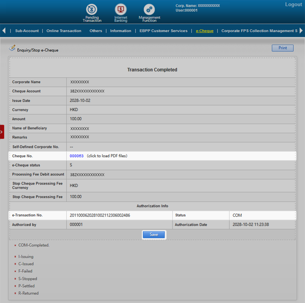 Transaction completed. Transaction Status and e-Transaction No. will be displayed. You may locate the e-cheque or save the confirmation by Cheque No. or Save respectively.