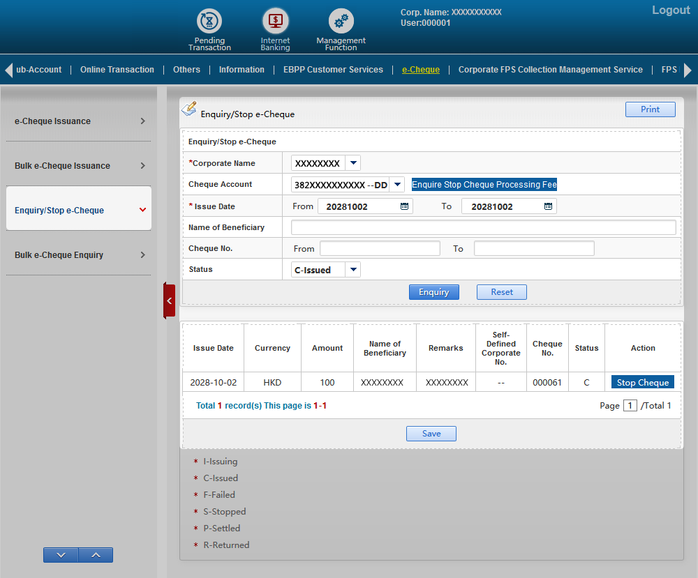 Please click Enquiry/Stop e-Cheque under e-Cheque, and input all column required on the right hand side and select Enquiry to continue. You would locate the specific cheque information. Besides, you would also make enquiry and download e-Cheque through "Online Transaction".